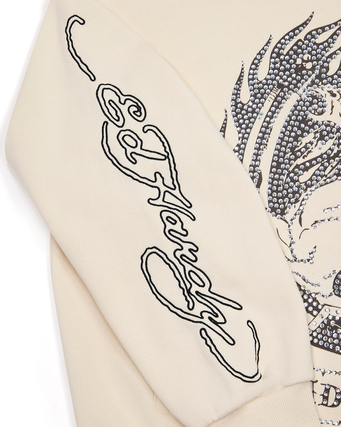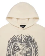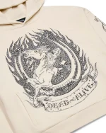 Crafted from premium heavyweight cotton fleece, this hoodie offers both comfort and durability. The soft cream colorway gives it a clean, luxurious look while serving as the perfect backdrop for the “Dead or Alive” rhinestone logo that sparkles across the chest. The shimmering rhinestones reflect light beautifully, adding a glamorous contrast to the hoodie’s rugged streetwear roots.